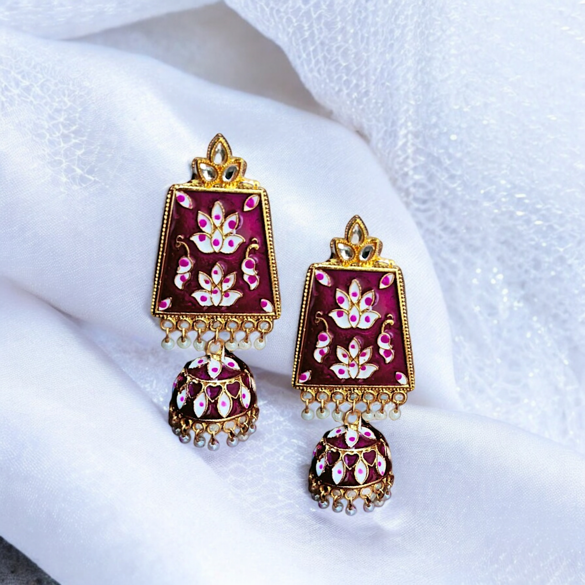 Meadow Enamel Jhumkas – Emerald Blush Earrings